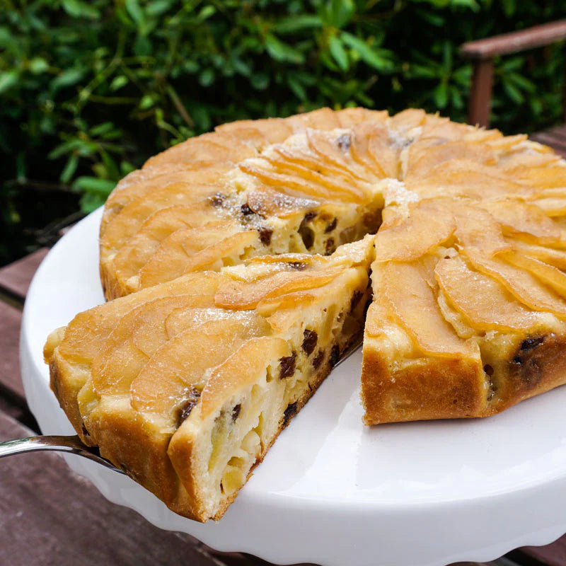 Mix all the ingredients (except the apple slices) into a smooth batter. Dice two apples and fold in, slice two more and place on top.
