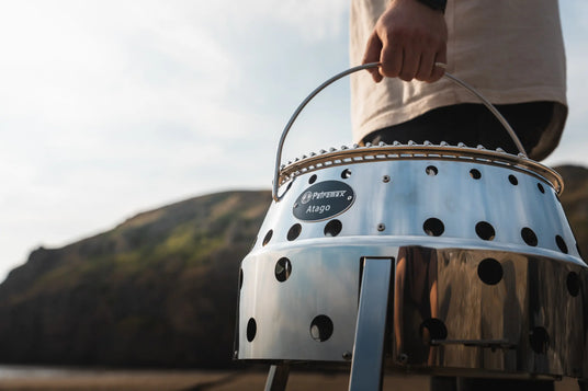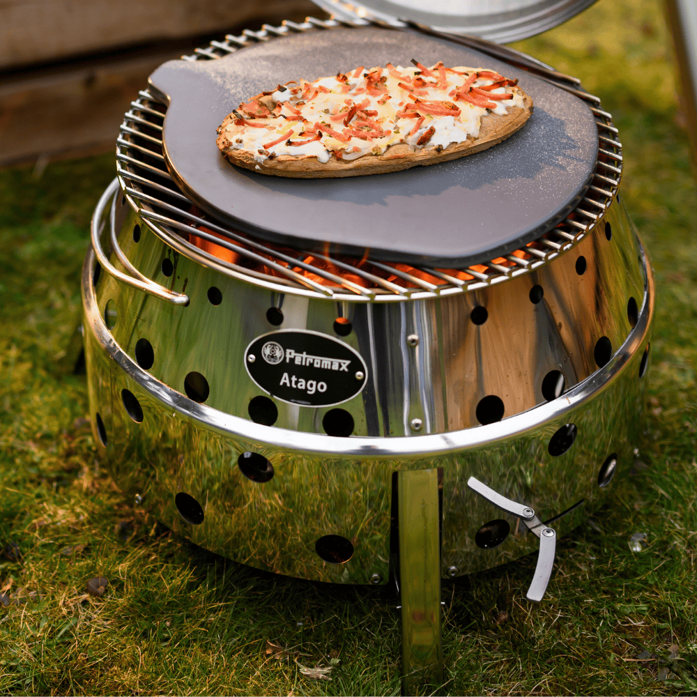 Das Atago Grill Set kombiniert einen ultramobilen 4-in-1 Grill mit passender Grillhaube und Pizzastein für vielseitiges Kochen, Backen und Grillen unterwegs.