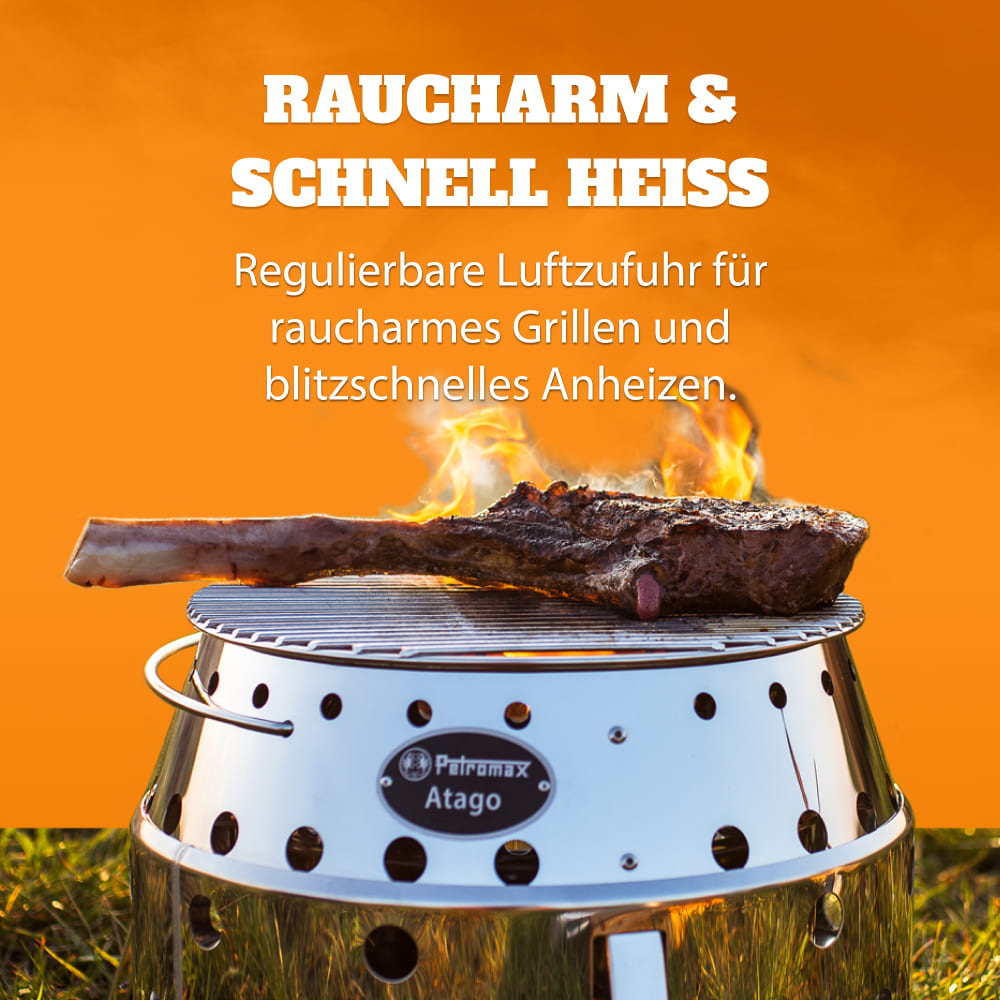 Durch die intelligente Luftführung brennt der Atago besonders gleichmäßig und raucharm. Der Kamineffekt sorgt für schnelles Anheizen, während die regulierbare Luftzufuhr dir volle Kontrolle über die Hitze gibt. Das Ergebnis: energiesparendes Grillen, konstante Temperatur und zuverlässige Leistung bei nahezu jedem Wetter.