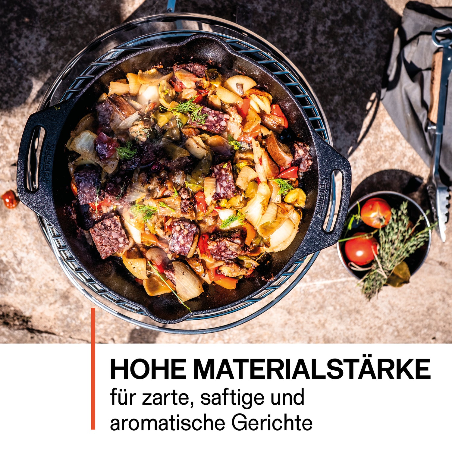 Prépare dans ton Dutch Oven d'une capacité de 3,5 litres pour toi et tes amis du chili con carne, du pain ou des gratins. Si tu cuisines sur un feu ouvert, tu peux simplement retourner le couvercle comme une poêle dans les braises et y faire cuire des steaks ou du poisson par exemple. Grâce aux trois pieds, le couvercle ne bascule pas.