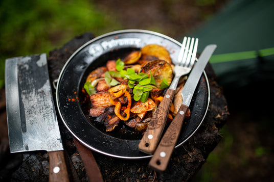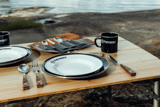 Thanks to the high-quality knife with double serrated edge on the right side, you can effortlessly cut your freshly grilled meat and use the rounded shape and wide blade ideal for spreading herb butter and co. In the set with spoons and forks, the sharp knife offers you the right tool for every use. The camping cutlery set with handles made of real wood: original character for the outdoor kitchen The camping cutlery with the lasered Petromax lettering is not only functional, but also fits perfectly into your outdoor kitchen due to its original character. You can customize your camping cutlery with a ribbon that you pull through the eyelet to hang it in your camper or on your backpack. The high-quality stainless steel is easy to clean by hand with detergent and water. With the Petromax camping cutlery you have the right cutlery for every meal at hand and enjoy your adventure menu wherever you are.