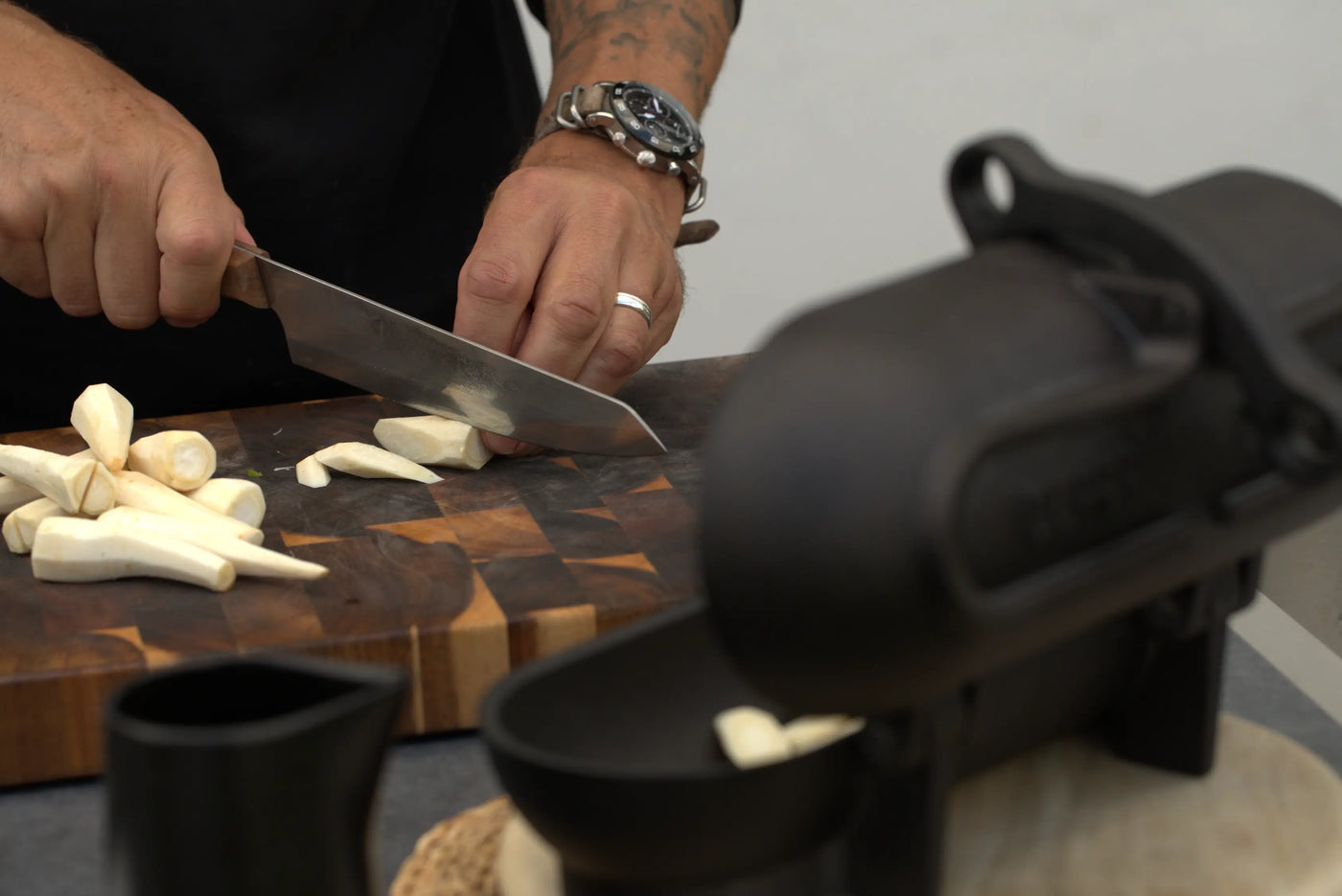 As always, Andi prepares the recipe in proper style using the versatile Petromax appliances. The saddle of venison simmers in mulled wine, which is heated on the legendary HK500 high-pressure lamp. The speculoos dumplings are cooked effortlessly in the Dutch Oven hanging over the fire bowl, while the caramelized parsley roots are refined directly in the embers in the potato roaster.
